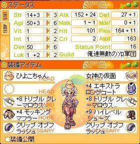 らうらうがオデンいってたからどこまで上がったか気になる! 今いくつまできたー?(ぇ オdンを諦めてアサになりた夢㌃育成をすることに。 氷に行こうか鳥人間に行こうか迷ったんですが・・・。 準備してたらみずのんがひまだからついてきてくれるって! マジデー∑(`ロ´;) ってほんと甘えすぎだよねー。 30分ちょっと頑張って転職まで@2に! サブ側がたまり場にいてログ見たら、 みずのんってばシリさんとなんだか約束がある様子。 一緒にきたらいいよって言ってくれたので図々しくもついて行ってきました。 中身3人しかいないのにキャラが6人!? はじめはシフでマリオ処理をしてたんですがどうかんがえてもみずのんはむこのが早い。 ということでシhを座らせてもらって、LKでダークフレーム釣りに。 石化がうざかったけどがんばったよ!(*ノェノ) 途中でJobが40に! ワーィヽ(´□`。)ノ 転職直後のSSです。 Base51/Job1の夢㌃。 このままAgi上げてスリッパのFleeを目指してからStrを上げようと思います。 今日は会議。 帰るのが早ければ22時ごろかなぁ。 オデンいけないと思うけどいけたらいきたいなっ。 ラグナロク☆ねっとわーく キャラ着せ替えで染色が対応されてます。 染色考えてる人参考にできるかと。 左のChara SimulatorのRO Dresserより PR この記事にコメントする